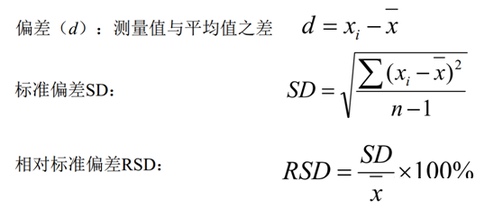 偏差、标准偏差、相对标准偏差计算公式如下所示: